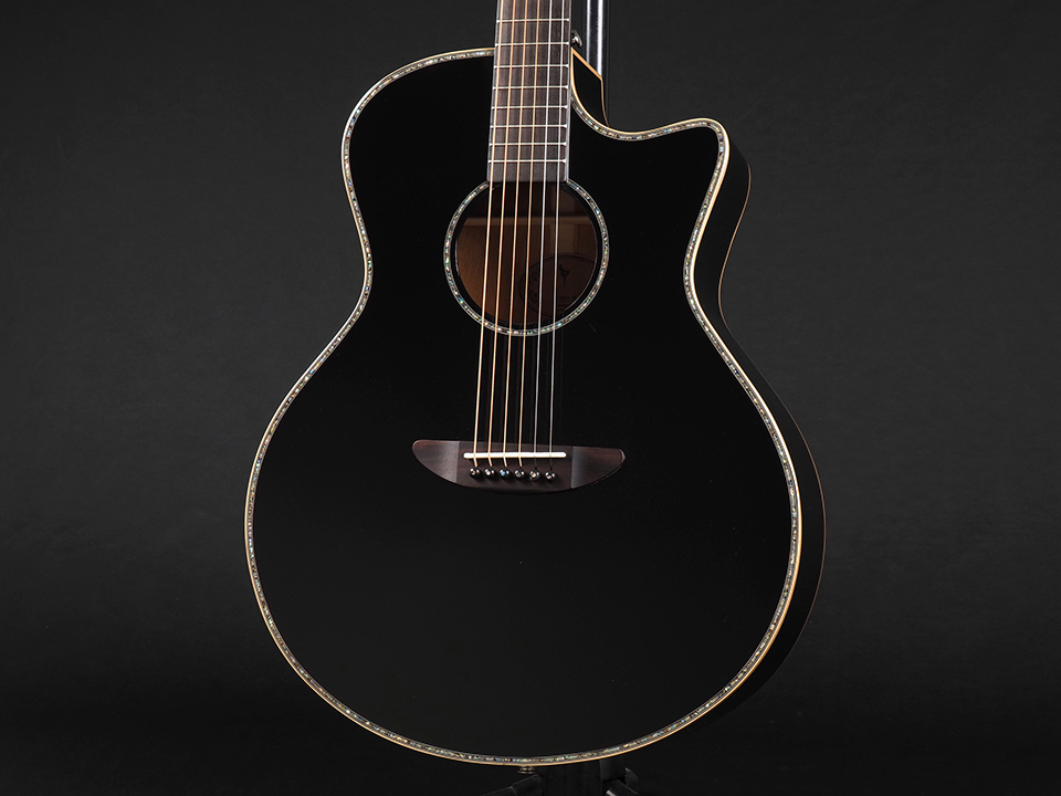 外観面でも、光沢のあるブラックカラーとアバロンパフリングのコントラストが非常に美しく、さらにメイプル材のウッドバインディングが上品なアクセントを添えています。