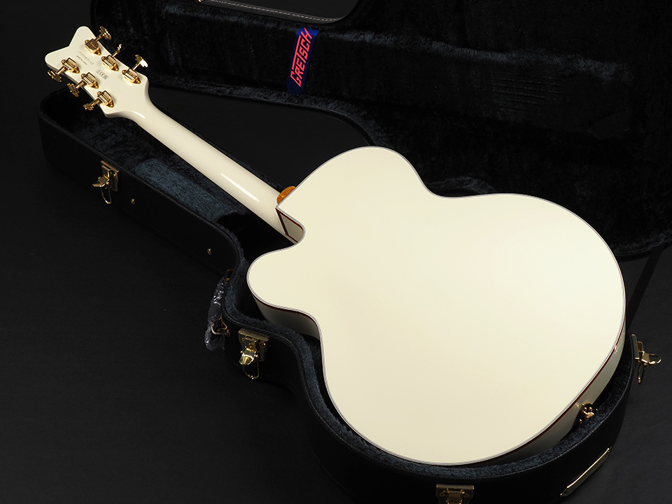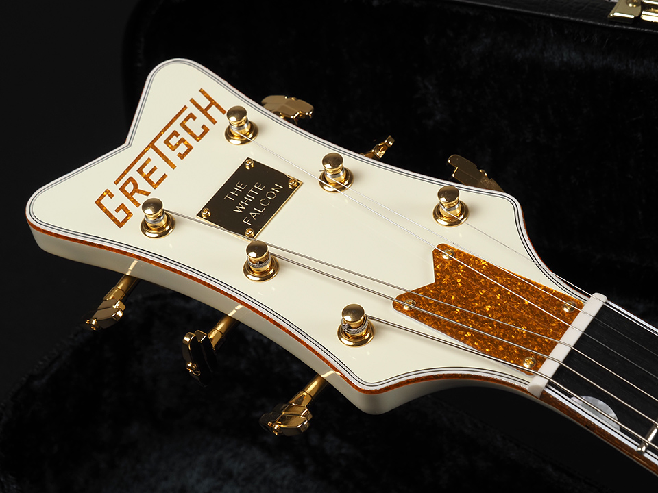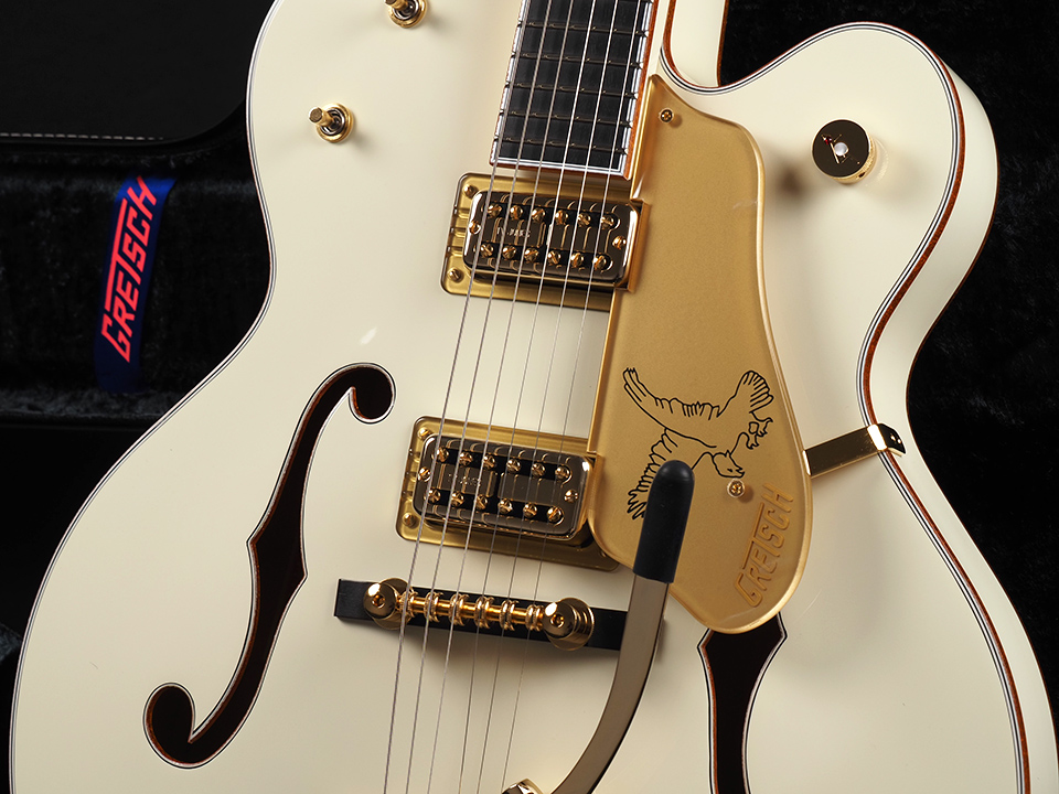 ゴールドスパークルバインディング、ゴールドハードウェア、ヴィンテージホワイトのグロス・ニトロセルロースラッカーフィニッシュ、Gretschロゴ入りのゴールド・ヴィンテージ・プレキシピックガードなど、随所に施されたラグジュアリーな装飾が、本機の圧倒的な存在感を演出しています。