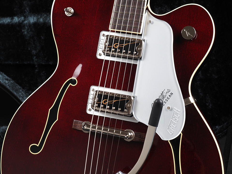 Gretschの伝統美を細部にまで宿しながら、深みのあるダークチェリーカラーによって気品とヴィンテージ感を兼ね備えた佇まいに仕上がった1本です。ロック、カントリー、ブルース、ジャズなど、あらゆる音楽スタイルに対応する一本。その個性的なサウンドを、ぜひ体感してください。