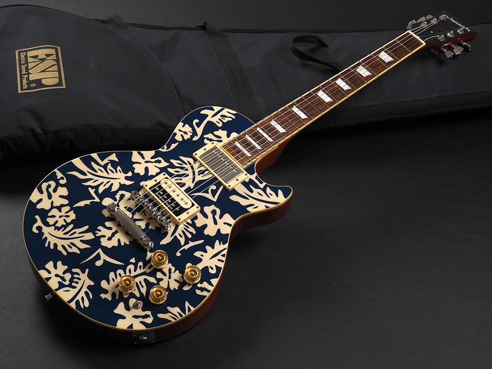 LPスタイルを基本に、健さんが”当時着ていたアロハシャツの柄”をボディトップに落とし込んだド級の存在感を放つ一本です。