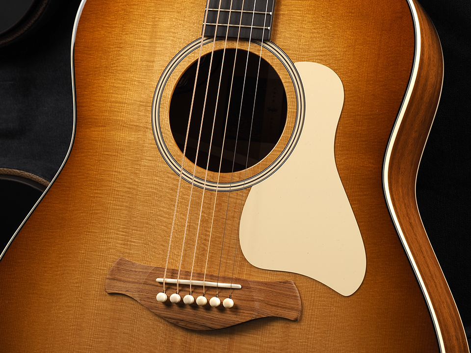 ルックス面では、サンバースト仕上げのトップにクリームカラーのピックガード、スクリプトロゴをあしらったモディファイド・ヘッドストックなど、1950年代のアコースティックギターを彷彿とさせるビンテージテイストが随所に光ります。指板とヘッドにはクリーム色のクレストインレイを施し、高級感あるルックスに仕上げています。