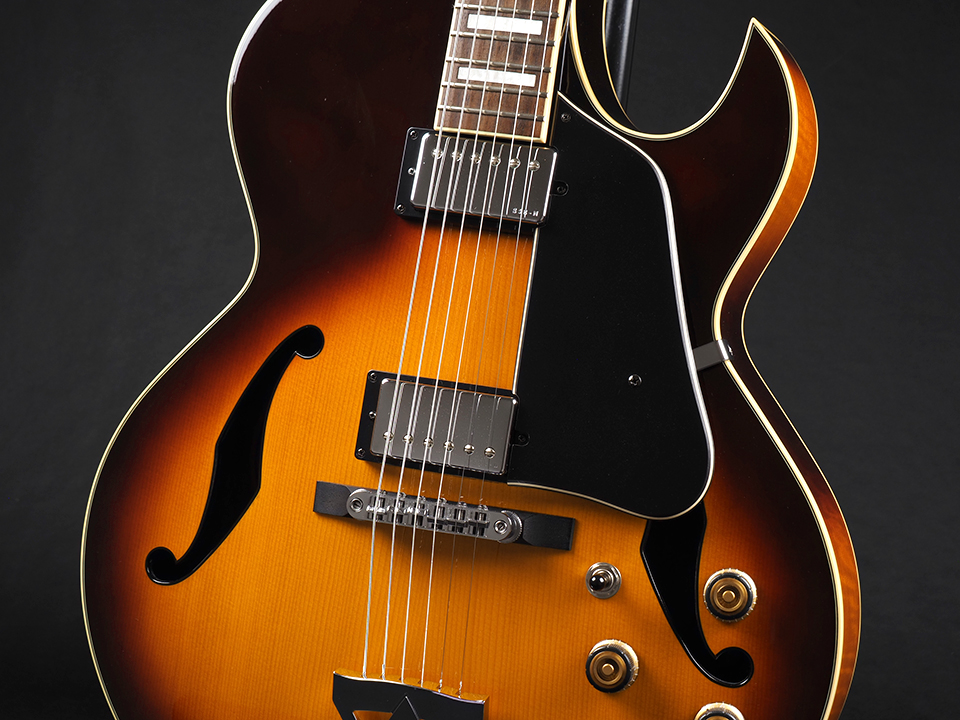胴厚は約70mmと比較的薄めで取り回しが良く、演奏性に優れた一本。初心者から中上級者まで、幅広くおすすめできるフルアコモデルです。