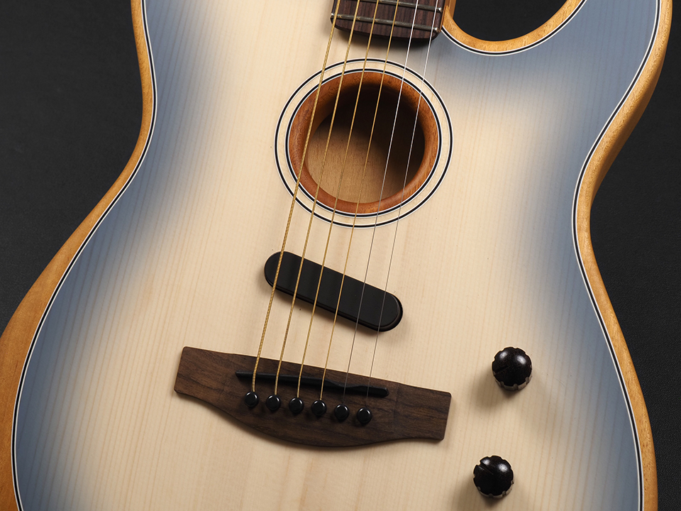 Fishmanアンダーサドルトランスデューサー、Fender Acoustasonic Noiselesピックアップの2種類のピックアップを搭載し、3wayボイスセレクターとModノブの操作により、6種類のギタートーンをベースとした多彩なサウンドバリエーションを生み出します。