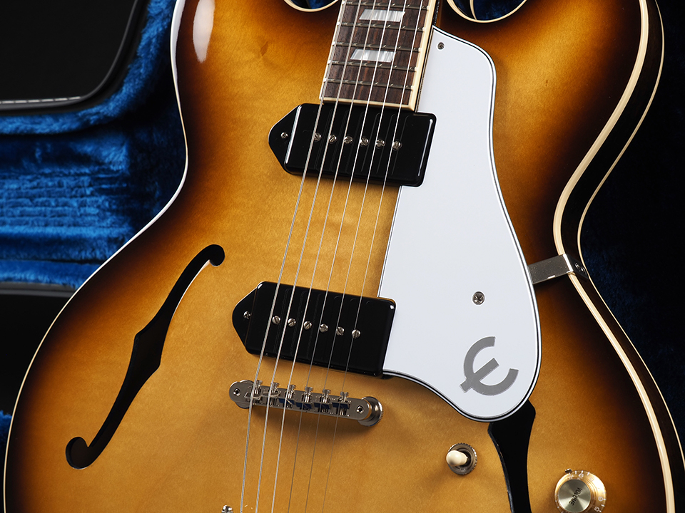 電装系はハンドワイヤリング配線で組み込まれ、Orange Dropコンデンサを採用。ピックアップにはGibson USA製P-90 Dogearを2基搭載し、Casinoならではの甘さと芯のあるサウンドをしっかりと再現しています。