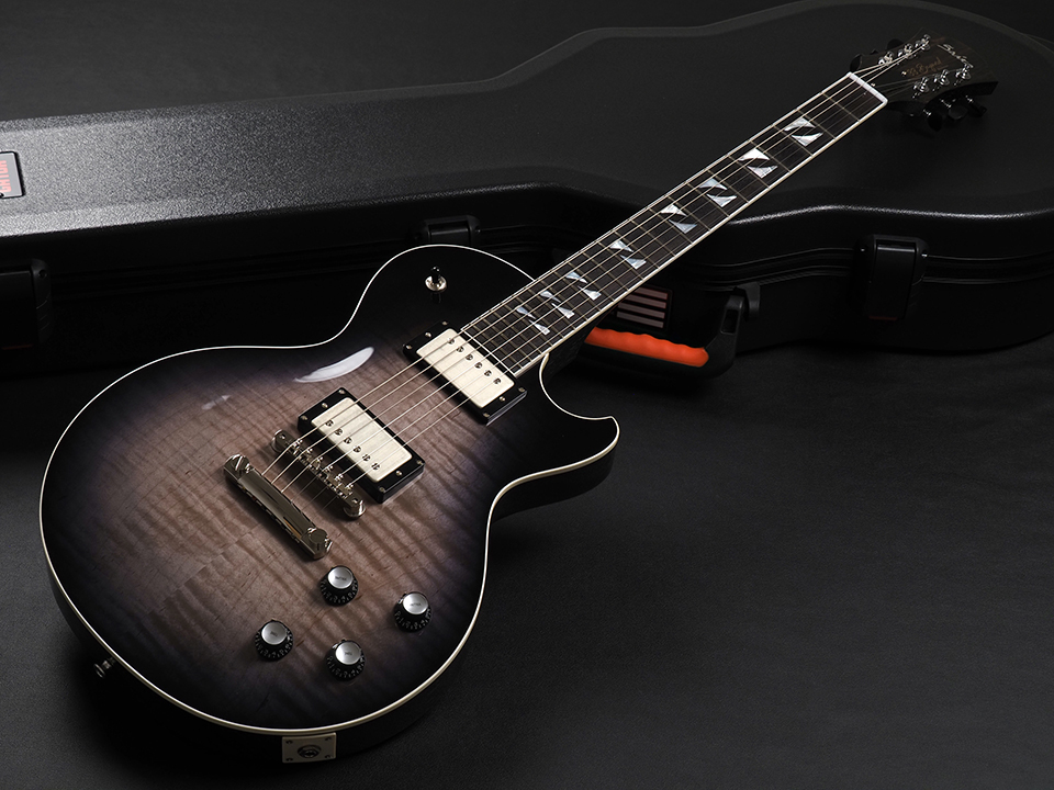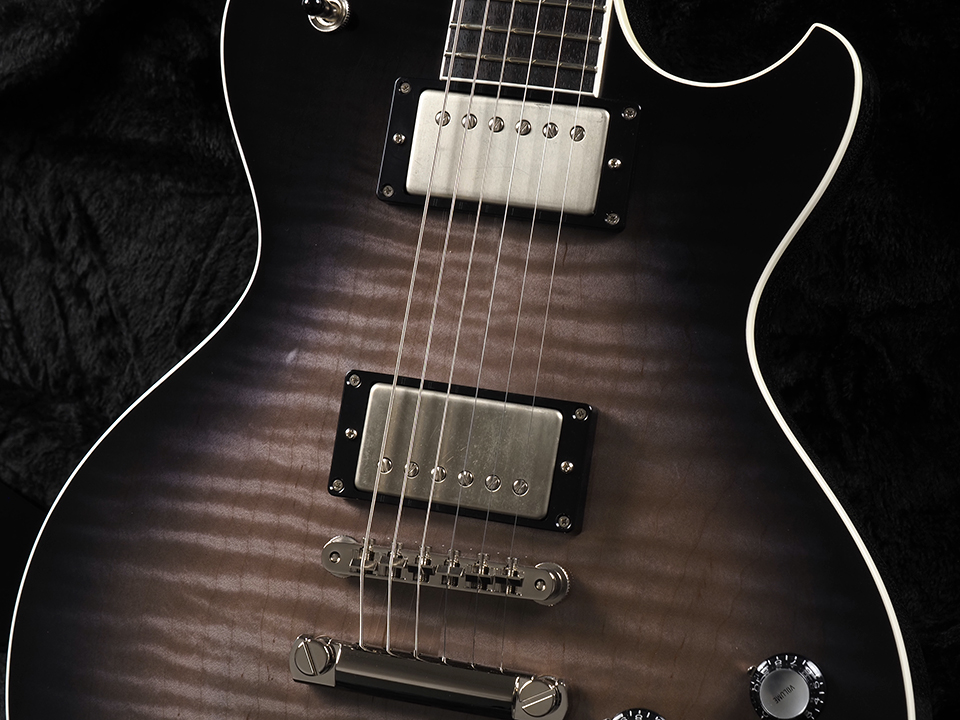 マスターグレードのフレイムメイプルトップ、ホンジュラスマホガニーバックのボディに、ローズ指板のホンジュラスマホガニーネックをセットジョイント。