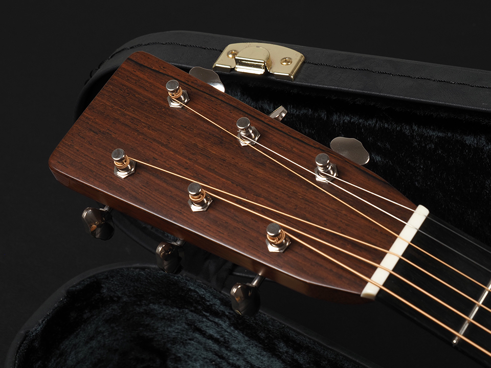 本機は、トップにアディロンダック・スプルース単板、サイド&バックに希少なハカランダ(ブラジリアン・ローズウッド)を使用した、非常に贅沢な仕様を持つカスタムモデル。さらに、ネック内部にはエボニーロッドを採用するなど、細部にまでこだわり抜かれた1本です。