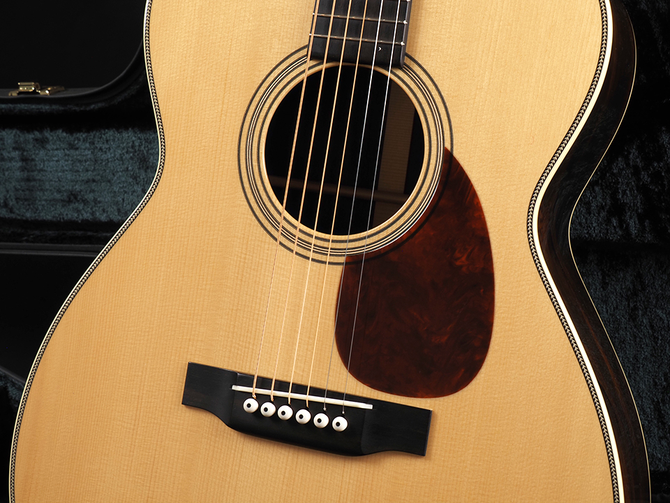 ボディサイズにはOMシェイプを採用し、豊かな音量感と優れたレスポンスを両立。スキャロップド・フォワードシフトXブレーシングとの組み合わせにより、アディロンダック材ならではの力強さと、ハカランダ特有の奥行きある倍音成分が融合した、立体感あふれるサウンドを生み出しています。