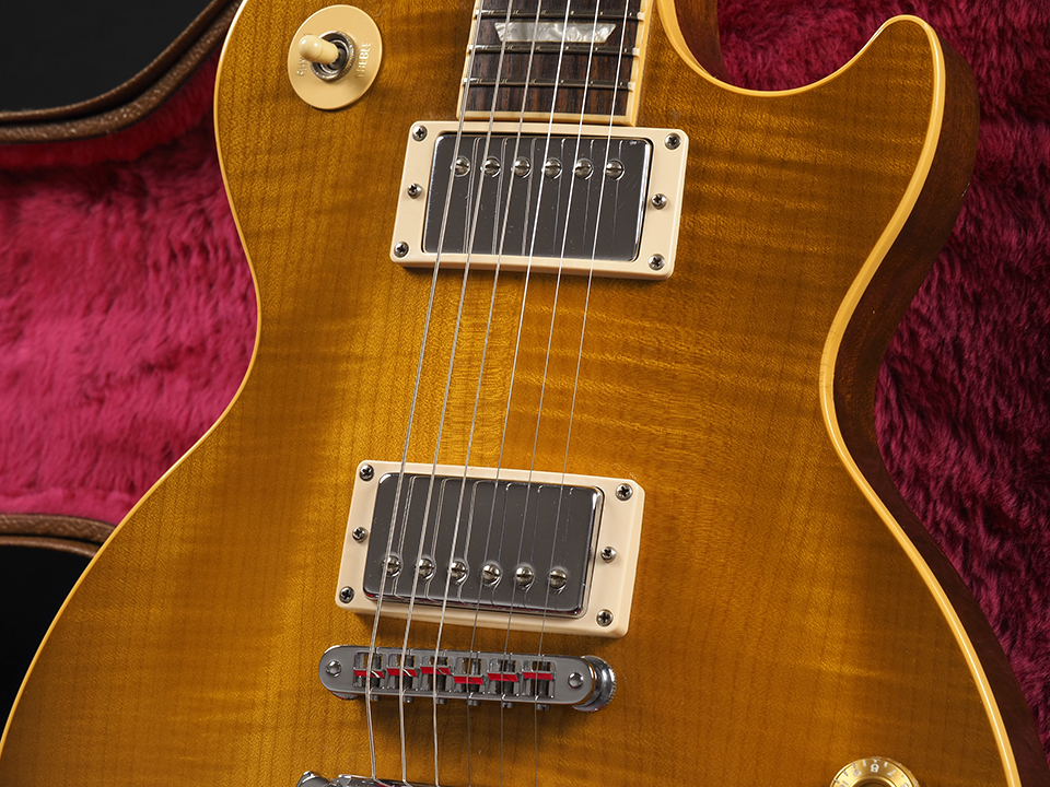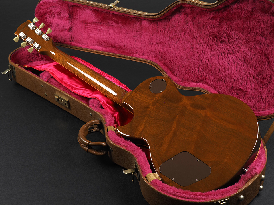 本機は、メイプルトップに1ピース・マホガニーバック、柾目のマホガニーネックを組み合わせた、当時ならではの王道かつ贅沢なウッドマテリアル構成を採用。30年近い年月を経たことで、木材の鳴りも十分に熟成され、現行モデルでは味わえない深みのあるレスポールサウンドを楽しめる一本に仕上がっています。