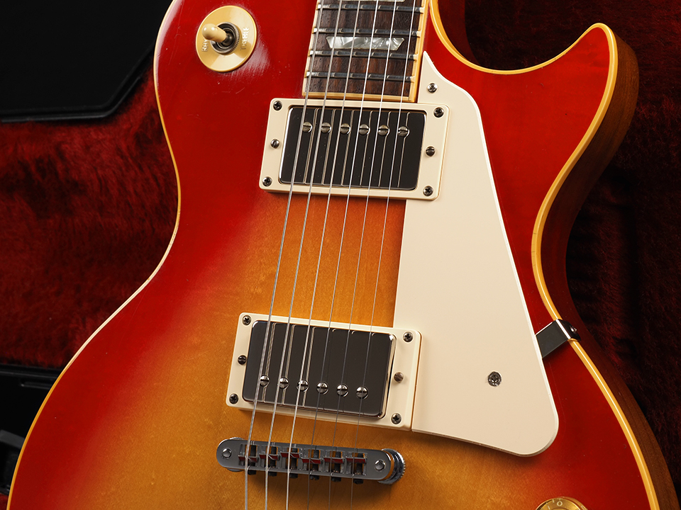 1970年代後期から1980年代初頭のスタンダードは、3ピース・メイプルネック、3ピース・メイプルトップ、1ピース・マホガニーバックといった当時特有のウッドマテリアル構成を採用しており、タイトさと深みを兼ね備えたサウンドが特徴です。ヴィンテージ期の甘さとは異なる、アタック感の強いロック向きのトーンも、この年代ならではの個性と言えるでしょう。
