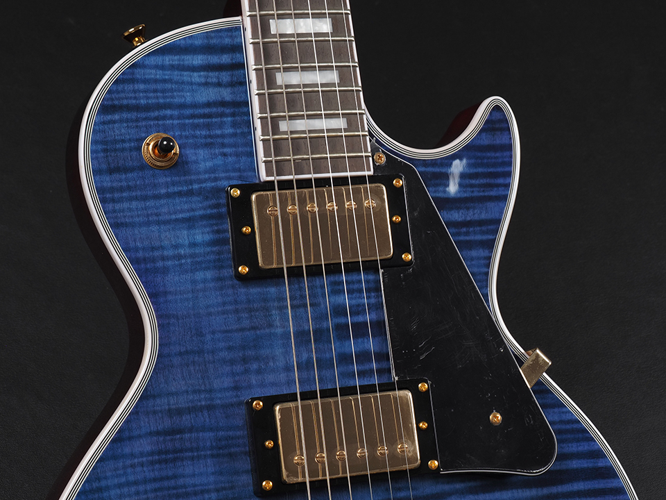 美しいシースルーブルーが映える本機は、ボディトップにフレイムメイプルを採用。個体ごとに異なる杢目が浮かび上がり、ポリッシュ仕上げによる艶やかな光沢と相まって、立体的なアーチトップの存在感を一層引き立てています。見た目の華やかさと上質感を兼ね備えた、魅力的な印象を与える一本です。