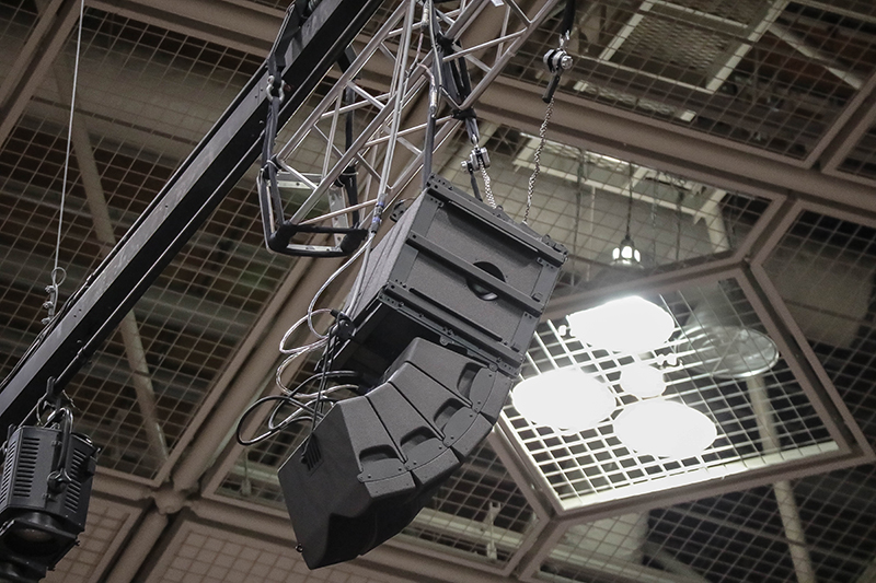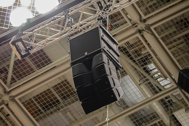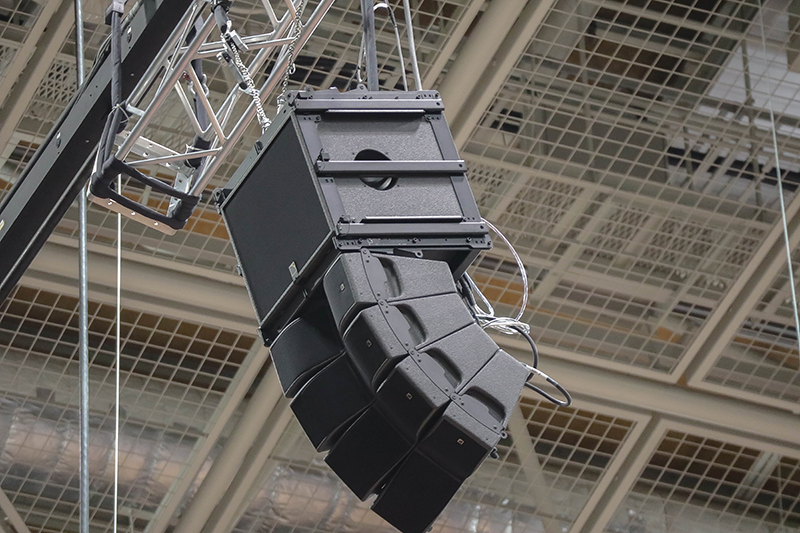 体育館など、広範囲に渡って音声の明瞭度が求められながらも、吊り重量に制限がある現場において最適解となります。